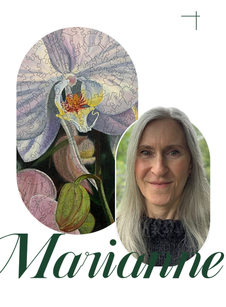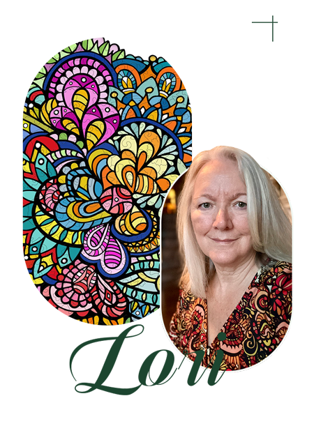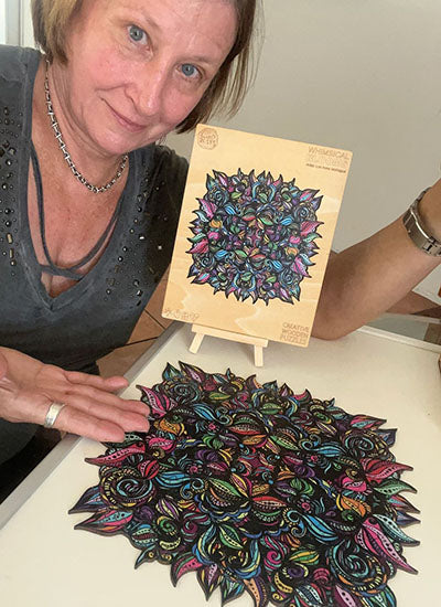 Lori Anne McKague, 40-year graphic design veteran, creates kaleidoscopic freestyle illustrations that challenge puzzle lovers with intricate patterns.