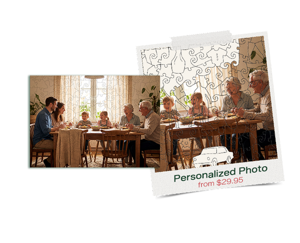 Personalized photo puzzles, uniquely shaped pieces, premium wood. Screen-free fun, perfect gifts.