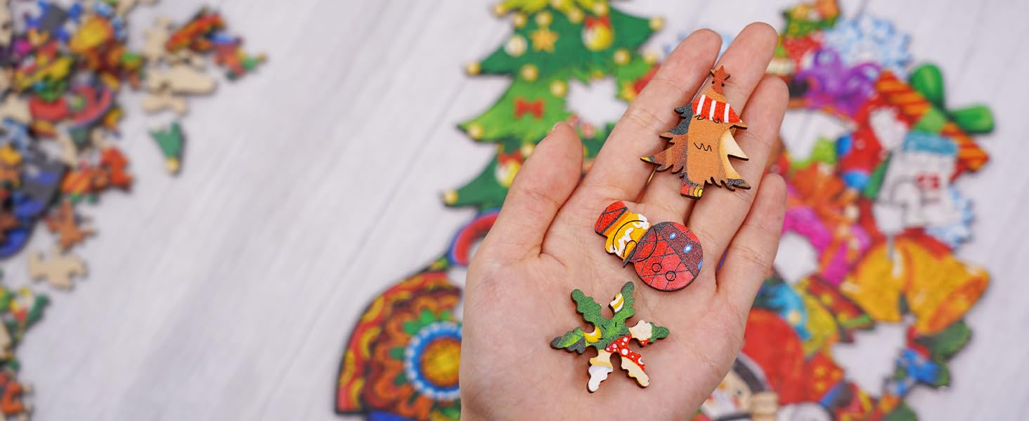 Vibrant jigsaw puzzle pieces being assembled, showcasing colorful designs and natural basswood material.