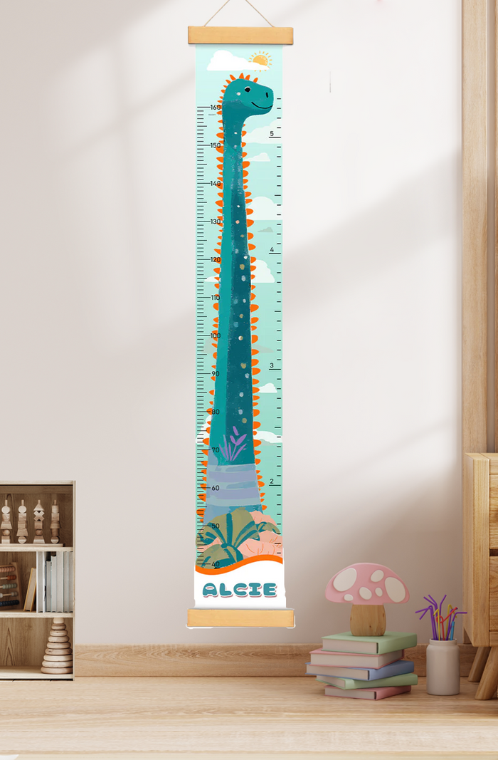 This whimsical dinosaur-themed growth chart serves as both a functional measuring tool and an eye-catching decoration, perfect for a nursery, bedroom, or playroom.