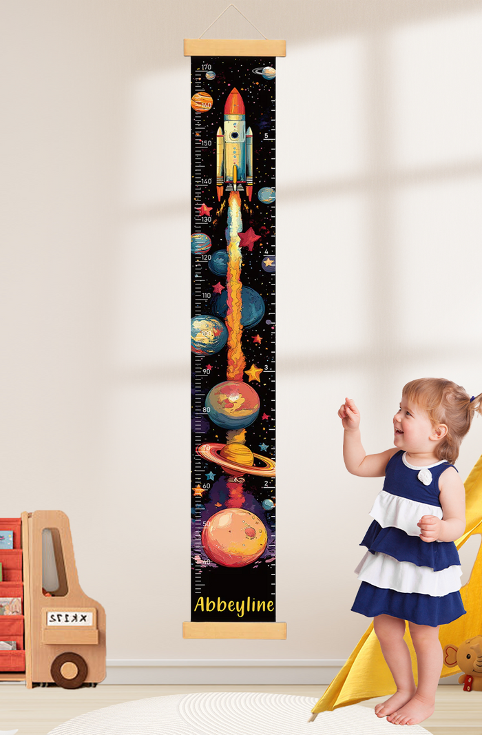 This Personalized Space Rocket Canvas Growth Chart is designed to ignite a child's love for space while tracking their growth. Featuring a vibrant cosmic theme with a soaring rocket, colorful planets, and twinkling stars, this chart brings a sense of adventure to any child's room. Made from high-quality, non-toxic canvas, it’s a durable and eco-friendly keepsake that turns every growth milestone into an exciting journey.