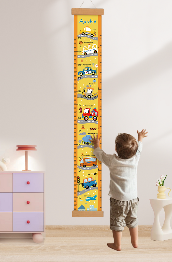 Turn growth into an exciting adventure with this Personalized Vehicle Hanging Canvas Height Ruler! From fire trucks and police cars to airplanes and taxis, each level is filled with colorful vehicles kids love. Printed on durable canvas with wooden hangers, it doubles as a functional growth tracker and a playful wall decoration.