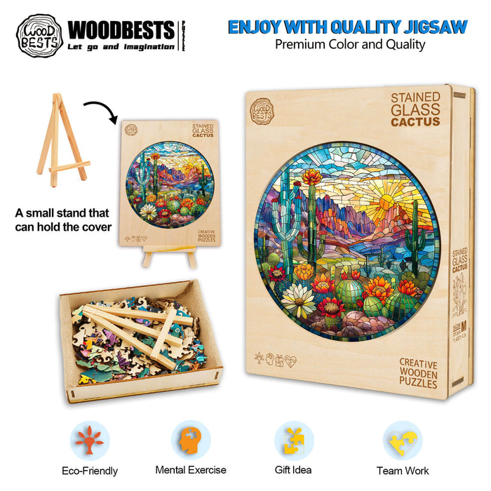 This nature-themed wooden puzzle recreates a stained-glass cactus landscape with a pointillist-inspired design. Bold UV-printed colors mimic the brilliance of sunlight filtering through glass, while laser-cut geometric patterns evoke the texture of cactus spines and desert sands. Ideal for fans of stained glass puzzles or Southwestern décor.