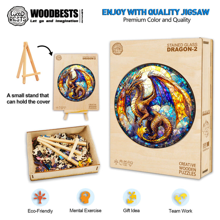 This stained-glass wooden puzzle features a golden dragon soaring across a mosaic of vivid, UV-printed colors that mimic the brilliance of traditional stained glass. The intricate patterns and shimmering details transform the finished puzzle into a decorative masterpiece, ideal for display in living rooms, offices, or as part of a dragon jigsaw puzzles collection .