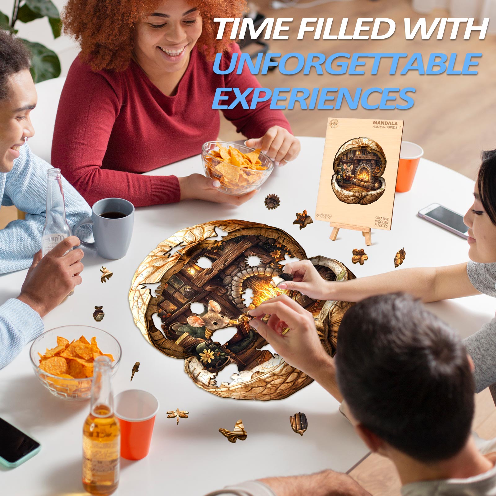 Immerse yourself in the whimsical world of Mouse's Walnut House, a handcrafted wooden jigsaw puzzle designed to spark creativity and provide hours of mindful entertainment. Perfect for kids, adults, and puzzle enthusiasts, this animal-themed wooden puzzle features a cozy walnut-shell home complete with a crackling fireplace and a book-loving mouse protagonist. With intricate laser-cut details and vibrant UV-printed imagery, this puzzle transforms into a timeless keepsake or decorative piece for any space.