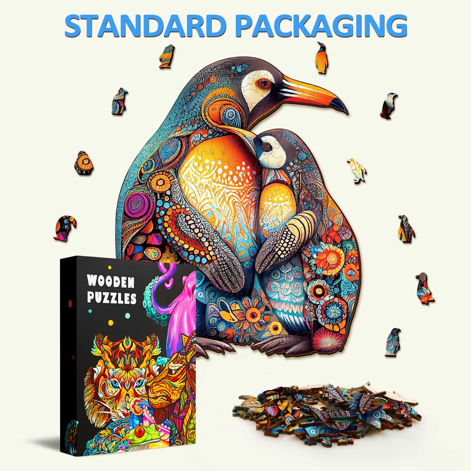 Penguin Family Wooden Jigsaw Puzzle Warm your heart with this adorable animal puzzle, featuring two floral-patterned penguins embracing in a snowy wonderland. Perfect for families and wildlife enthusiasts, this cute puzzle blends emotional charm with brain-teasing fun for all ages.