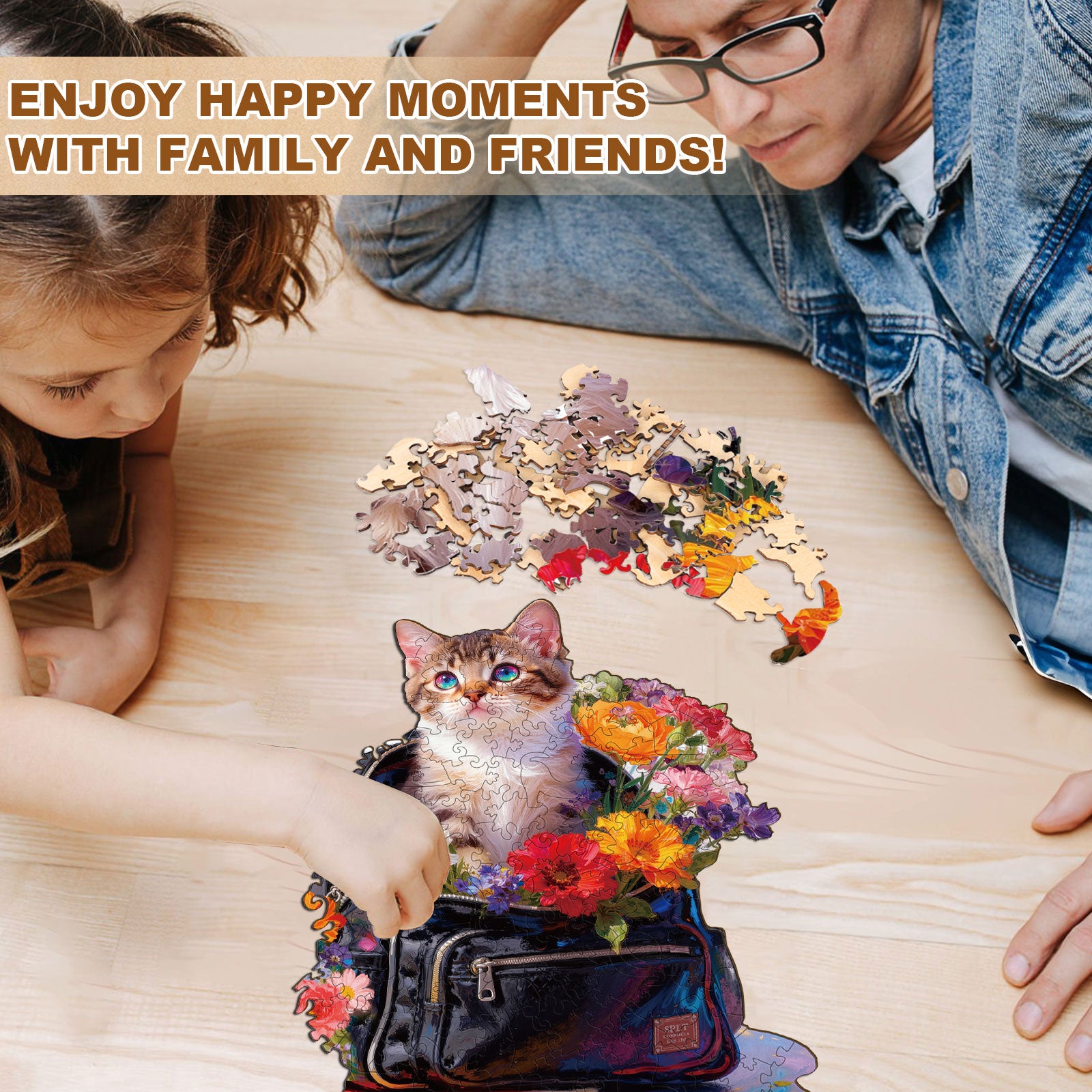 This Flower Bag Cat Wooden Jigsaw Puzzle can take you to be a jigsaw puzzle explorer, like online sudoku puzzles,designed for mind games.The process of puzzle solving will make you become more focused and smarter.