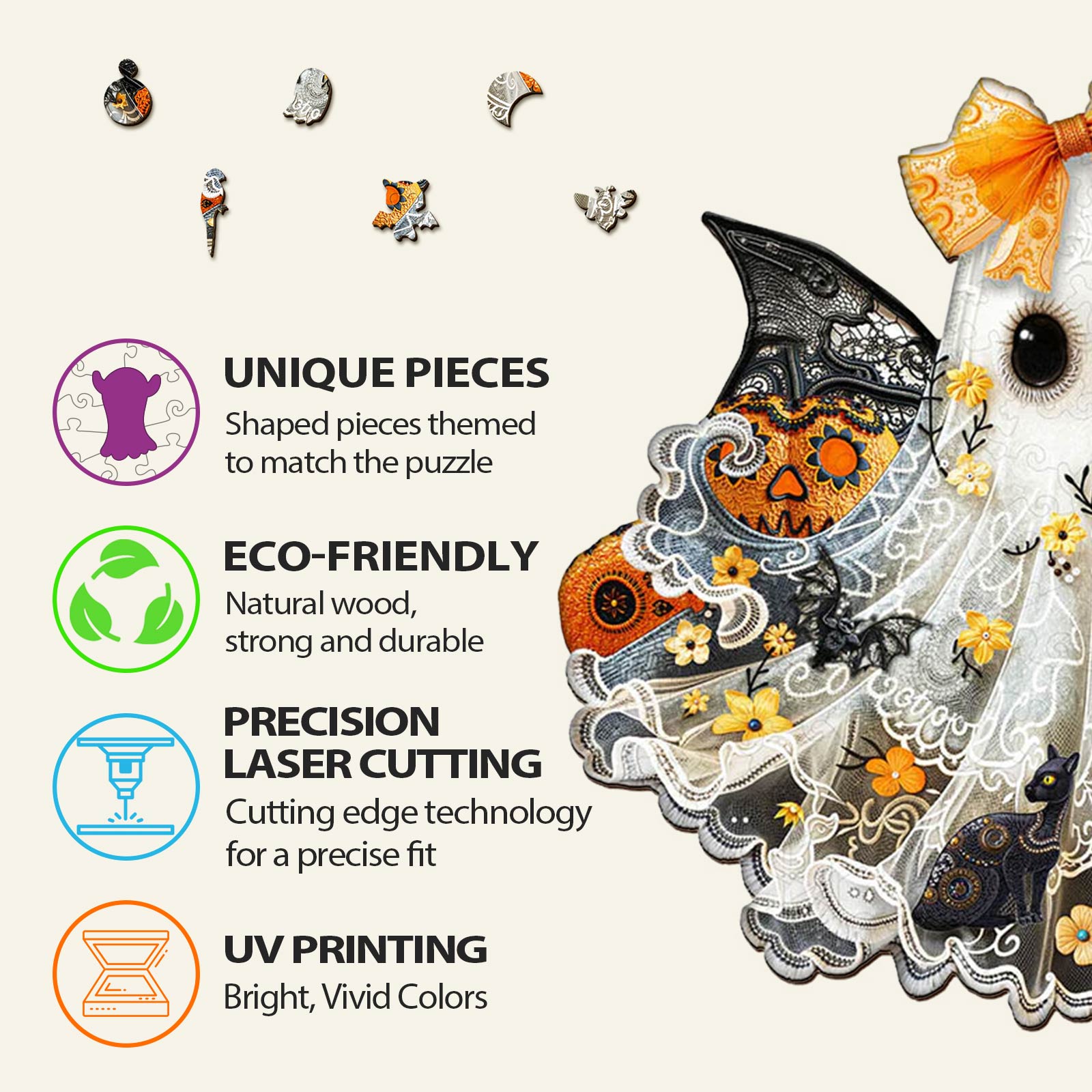 This Little Miss Ghost Wooden Jigsaw Puzzle can take you to be a jigsaw puzzle explorer, like online sudoku puzzles,designed for mind games.The process of puzzle solving will make you become more focused and smarter.