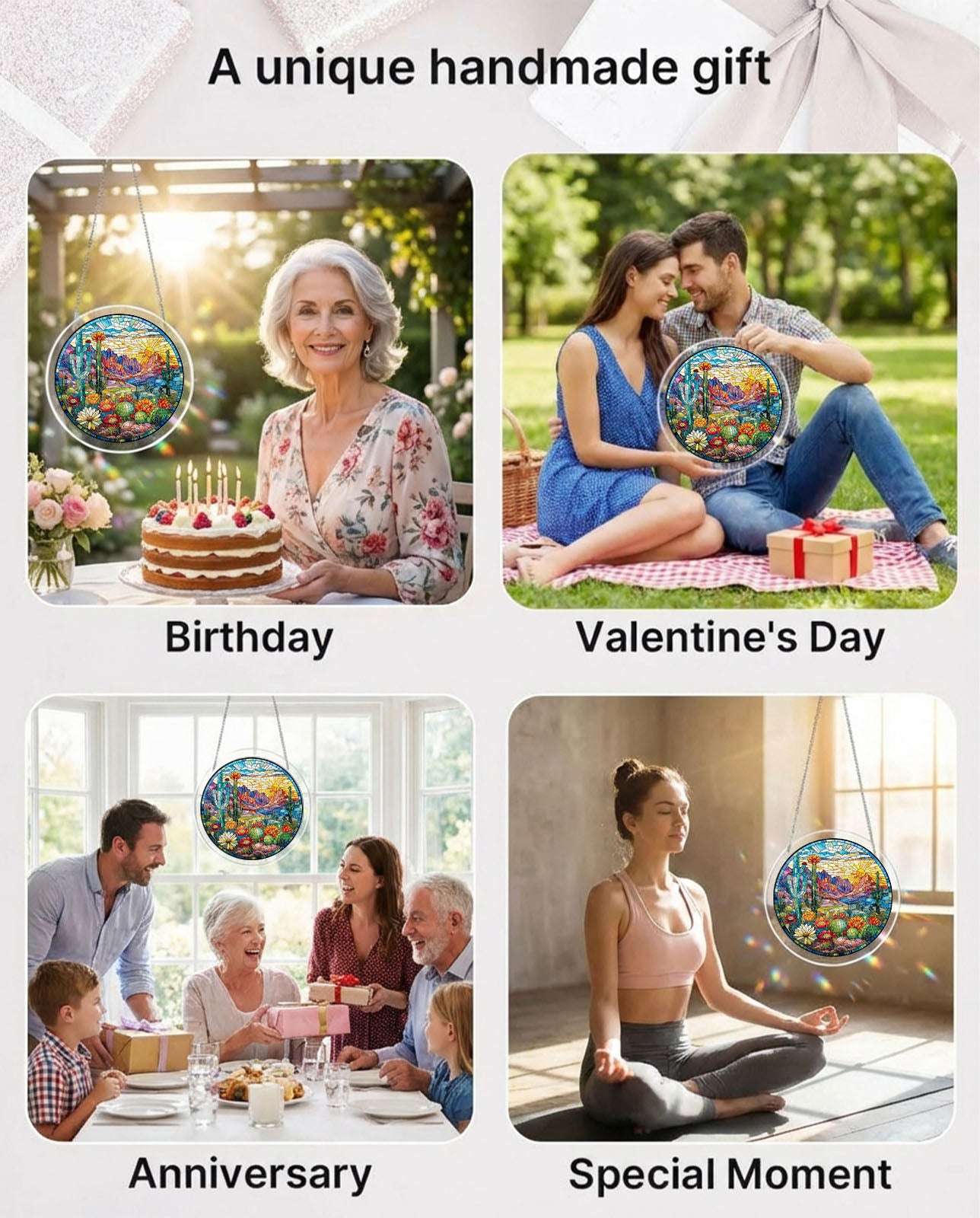 This desert sunrise scene features a vibrant stained-glass aesthetic that transforms into a dazzling suncatcher.
