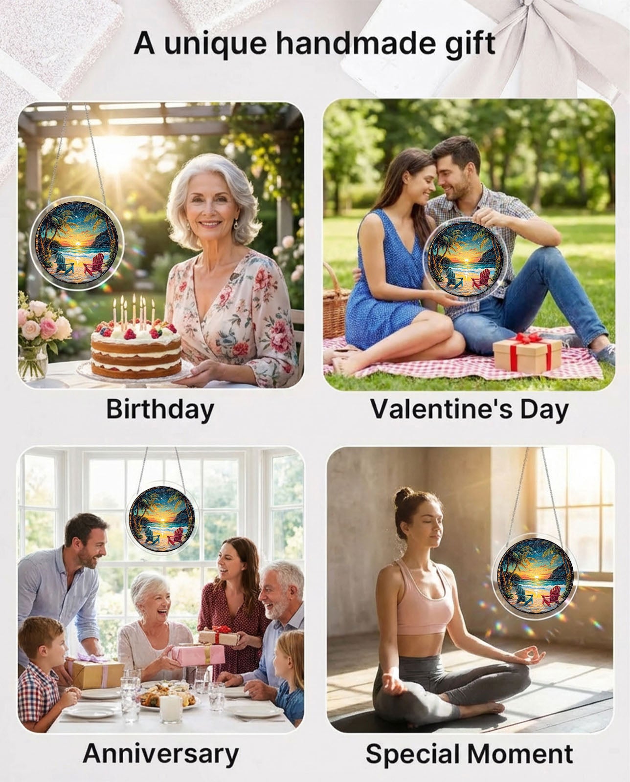This sunset scene features swaying palm trees, colorful beach chairs, and a vibrant stained-glass aesthetic that transforms into a dazzling suncatcher.