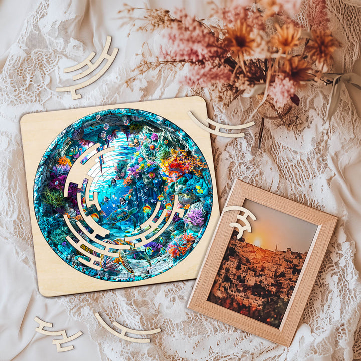 Colorful Blue Ocean maze puzzle on lace, surrounded by puzzle pieces and a framed photo, promoting focus and mental skill development.