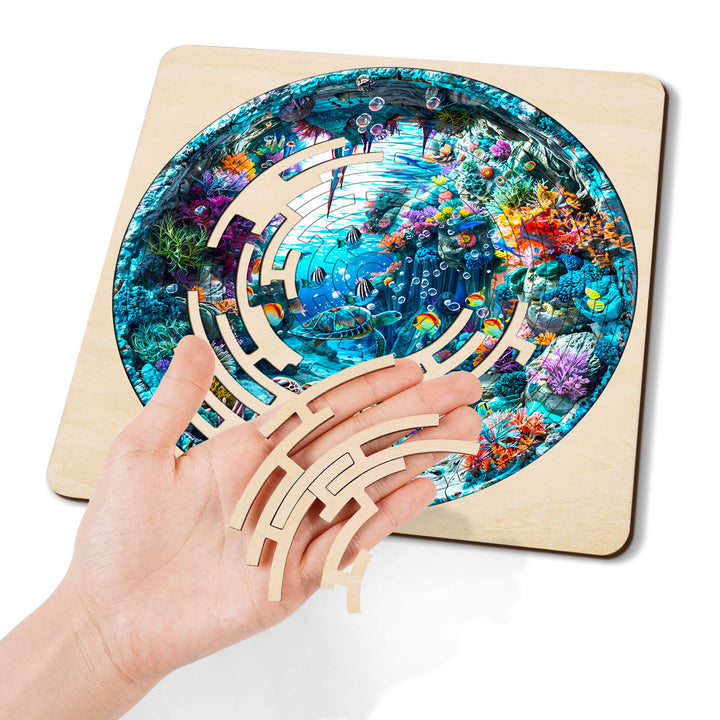 Colorful blue ocean maze puzzle featuring underwater scenery with fish, corals, and bubbles, measuring 20 cm.