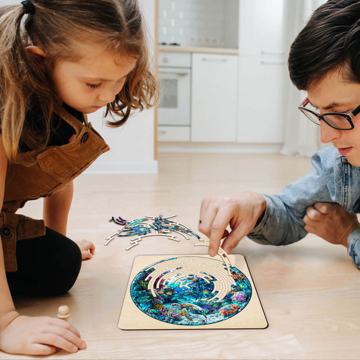 Adult and child enjoying the Maze Puzzles—Blue Ocean, focusing on jigsaw puzzle exploration together.