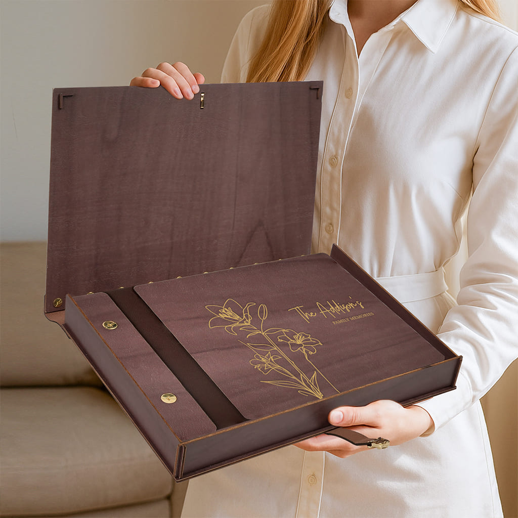 Wooden photo album - these are sealed with Watco Danish Oil Natural. This should protect your book for many years in most conditions. Do not get the books wet, or store in very humid conditions. Water and humidity can cause warping.