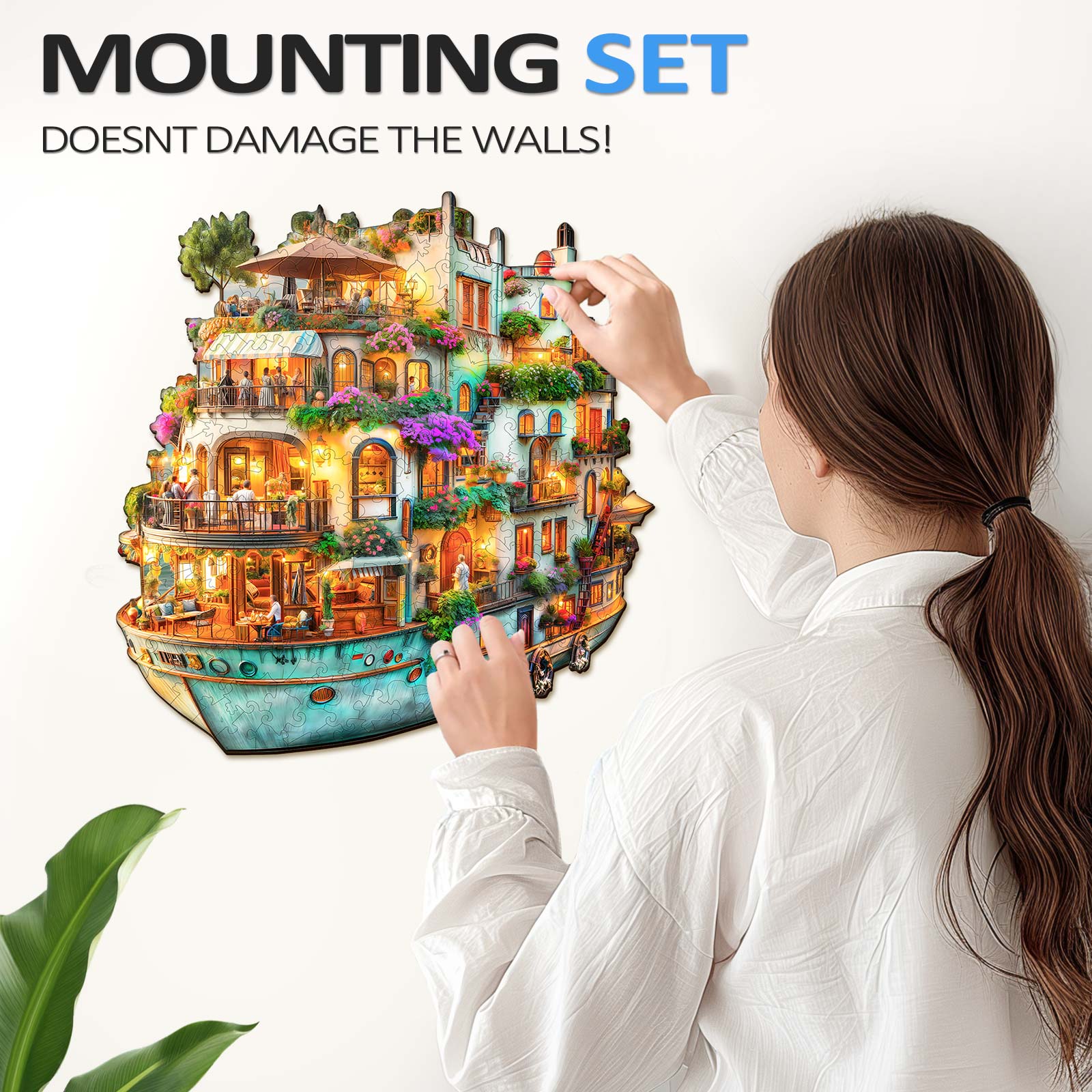 Voyage Garden Wooden Jigsaw Puzzle featuring a beautifully lit boat filled with flowers and cozy balconies.