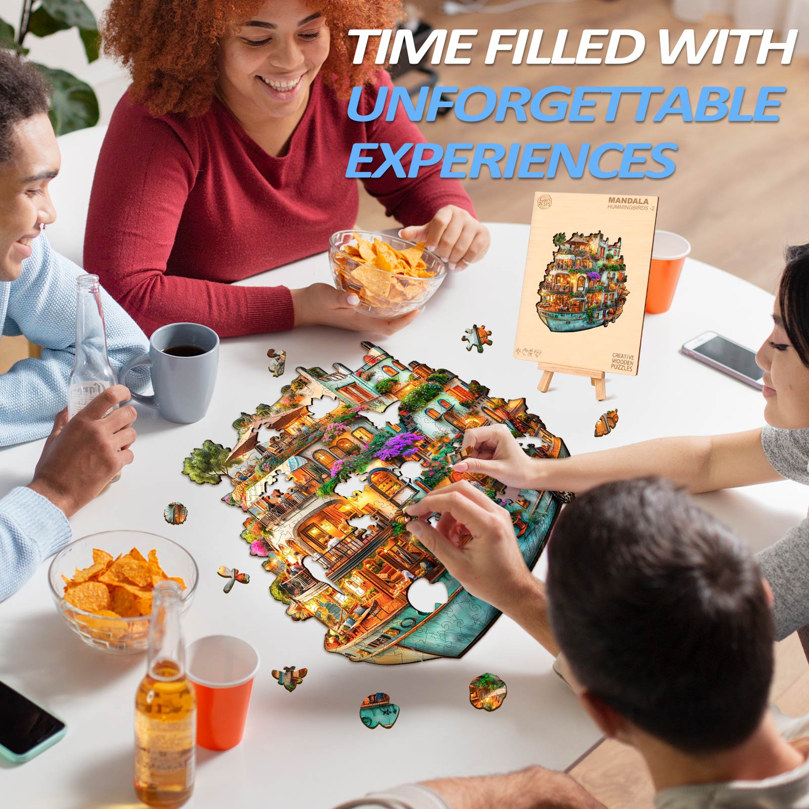 Voyage Garden wooden jigsaw puzzle featuring a 3D-like visual effect when completed, perfect for puzzle explorers.